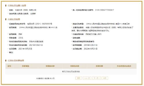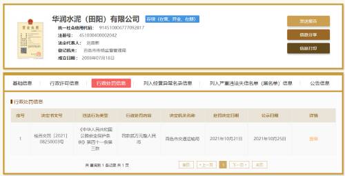 華潤水泥(田陽)有限公司在2021年10月21日被百色市交通運輸局罰款2萬元,主要違法事實為,當事人在華潤水泥(田陽)有限公司地點實施了指使、強令車輛駕駛?cè)顺捱\輸貨物的違法行為。
