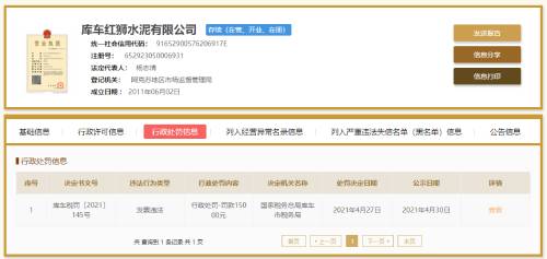 庫車紅獅水泥有限公司因發(fā)票違法被國家稅務(wù)總局庫車市稅務(wù)局于2021年4月27日處罰1500元。主要違法事實為“虛開發(fā)票”。