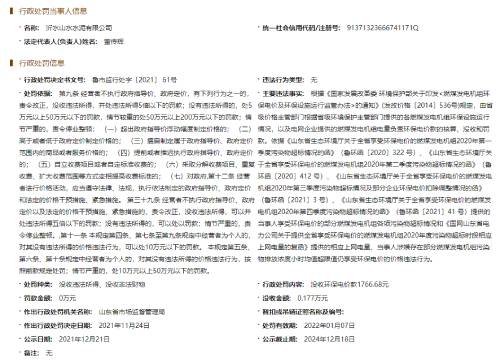 沂水山水水泥有限公司2021年11月24日被山東省市場監(jiān)管局處罰。沒收環(huán)保電價款1766.68元。違法事實為當事人涉嫌存在部分燃煤發(fā)電機組污染物排放濃度小時均值超限值仍享受環(huán)保電價的價格違法行為。