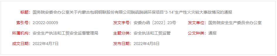 近日,國務(wù)院安委會辦公室通報(bào)了關(guān)于內(nèi)蒙古包鋼鋼聯(lián)股份有限公司脫硫脫硝環(huán)保項(xiàng)目“3·14”生產(chǎn)性火災(zāi)較大事故的情況。
