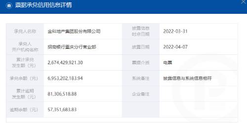 金科地產集團的票據(jù)承兌信用信息詳情顯示, 累計逾期發(fā)生額約8130.66萬元,逾期余額約5735.17萬元。