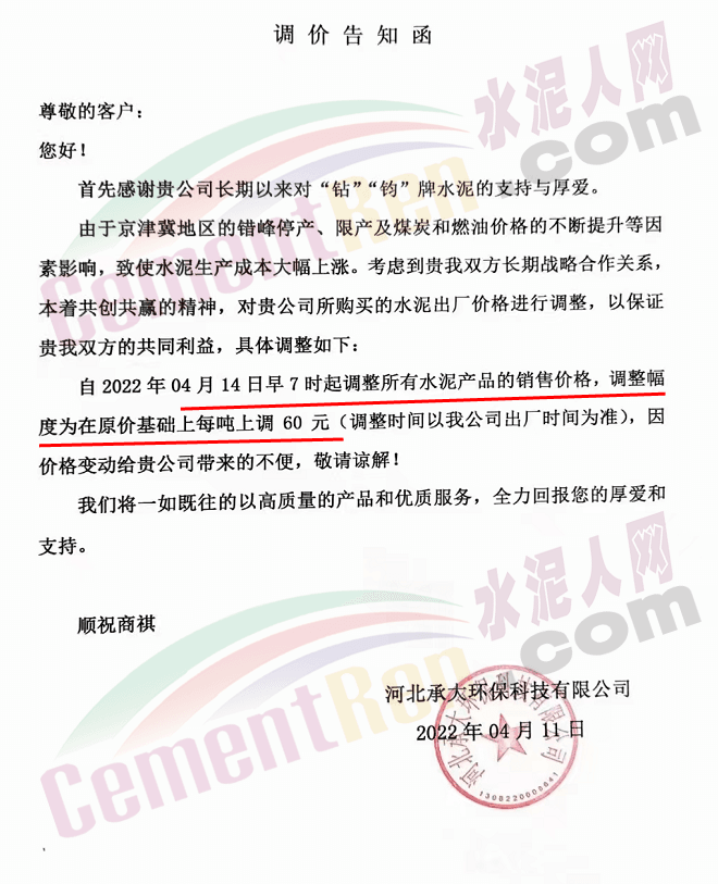 河北承大環(huán)??萍加邢薰就ㄖ?月14日早7時(shí)起,上調(diào)所有水泥產(chǎn)品的銷售價(jià)格60元/噸。