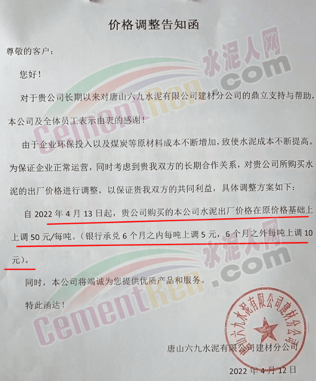 唐山六九水泥有限公司建材分公司通知自4月13日起,上調(diào)水泥價(jià)格50元/噸,銀行承兌6個(gè)月之內(nèi)上調(diào)5元/噸,6個(gè)月之外上調(diào)10元/噸。