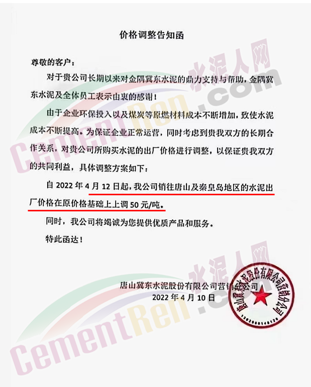 唐山冀東水泥股份有限公司唐山營(yíng)銷分公司通知自4月12日起,公司銷往唐山及秦皇島地區(qū)地水泥出廠價(jià)在原價(jià)基礎(chǔ)上上調(diào)50元/噸。