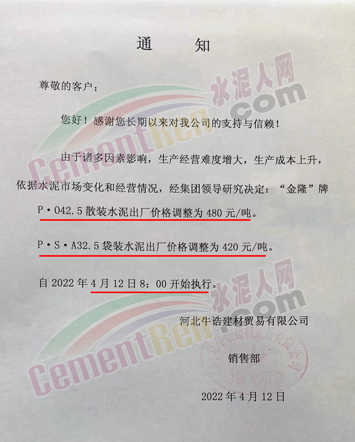 河北牛誥建材貿(mào)易有限公司通知由于諸多因素影響,生產(chǎn)經(jīng)營(yíng)難度增大 ,生產(chǎn)成本上升,依據(jù)水泥市場(chǎng)變化和經(jīng)營(yíng)情況,經(jīng)集團(tuán)領(lǐng)導(dǎo)研究決定,自4月12日8時(shí)起“金隆”牌P.O42.5散裝水泥出廠價(jià)480元/噸,P.S.A32.5袋裝水泥出廠價(jià)調(diào)整為420元/噸。