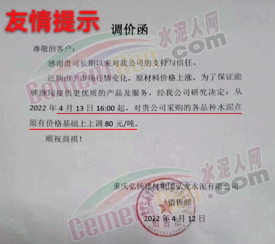 重慶弘揚(yáng)建材集團(tuán)弘龍水泥有限公司通知,由于市場(chǎng)行情變化,原材料價(jià)格上漲,為了保證能夠繼續(xù)提供更優(yōu)質(zhì)的產(chǎn)品及服務(wù),經(jīng)公司研究決定從4月13日16時(shí)起,上調(diào)各品種水泥價(jià)格80元/噸。