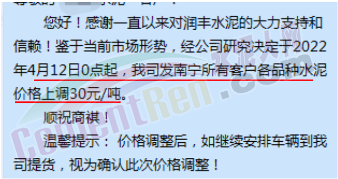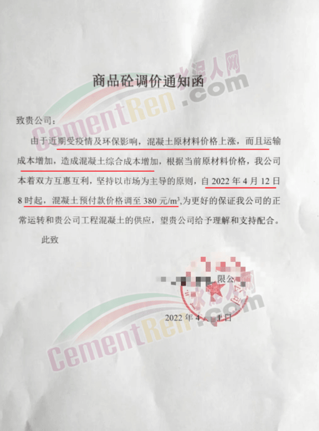 另一企業(yè)調(diào)價(jià)通知提到,原材料價(jià)格持續(xù)上漲,造成混凝土成本大幅上漲,公司通過(guò)內(nèi)部控制挖潛已經(jīng)無(wú)法克服原材料持續(xù)上漲帶來(lái)的成本壓力,為確?;炷临|(zhì)量,滿足供應(yīng),經(jīng)過(guò)多方面考慮,決定自4月12日起上調(diào)價(jià)格30元/立方。
