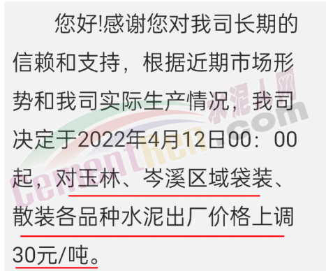 沙河市雙基水泥有限公司通知,由于疫情原因各原材料供應(yīng)不足,價(jià)格持續(xù)上漲,造成公司生產(chǎn),銷售等環(huán)節(jié)的成本大幅度上升,為保障公司可持續(xù)經(jīng)營(yíng)發(fā)展,鑒于當(dāng)前的市場(chǎng)情況,經(jīng)公司研究決定自4月12日中午12時(shí)起,P.O42.5散裝水泥出廠價(jià)格上調(diào)40元/噸。