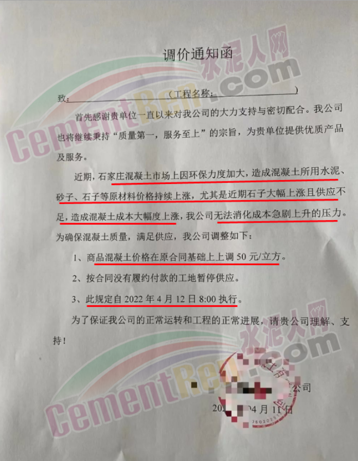 一企業(yè)通知函稱,近期石家莊混凝土市場(chǎng)上因環(huán)保力度加大,造成混凝土所用水泥、砂子、石子等原材料價(jià)格持續(xù)上漲,尤其是近期石子大幅上漲且供不應(yīng)求,造成混凝土成本大幅度上漲,公司無(wú)法消化成本急劇上升的壓力,為確?;炷临|(zhì)量,商品混凝土價(jià)格從4月12日8時(shí)起在原合同基礎(chǔ)上上調(diào)50元/立方。