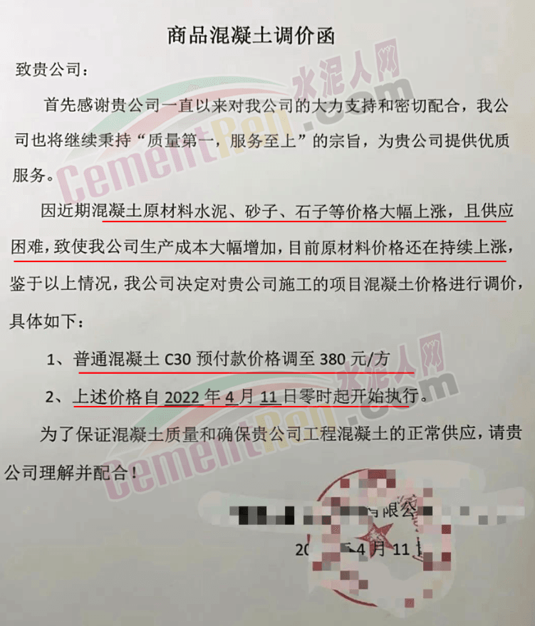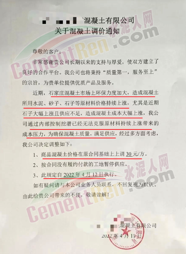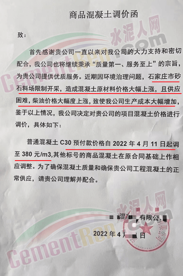 另一企業(yè)通知稱,近期因環(huán)境治理問題,石家莊市砂石料場(chǎng)限制開采,造成混凝土原材料價(jià)格大幅上漲,且供應(yīng)困難,柴油價(jià)格大幅度上漲,致使公司生產(chǎn)成本大幅增加,鑒于以上情況,公司決定自4月11日起普通混凝土C30預(yù)付款價(jià)格調(diào)至380元/立方。其他標(biāo)號(hào)的商品混凝土在原合同基礎(chǔ)上作相應(yīng)調(diào)整 。
