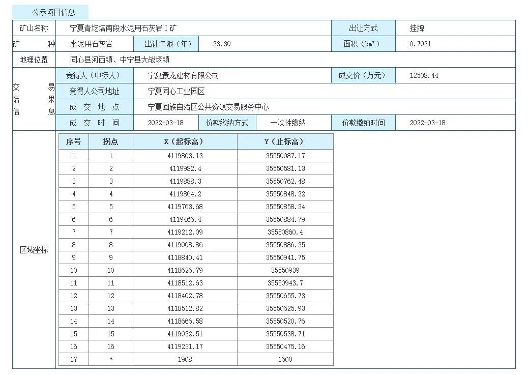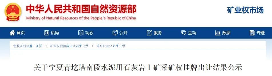 近日,自然資源部發(fā)布了關(guān)于寧夏青圪塔南段水泥用石灰?guī)rⅠ礦采礦權(quán)掛牌出讓結(jié)果公示。中國水泥網(wǎng)從公示中得知寧夏豪龍建材以1.25億元競得了該礦山采礦權(quán)。