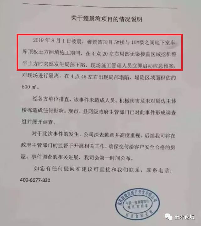 坍塌后,建設(shè)單位發(fā)布緊急通報,極力澄清車庫坍塌不會影響主樓結(jié)構(gòu)安全,通報稱第一時間上報政府相關(guān)監(jiān)管部門,隨即住建部門委派了湖南大學(xué)結(jié)構(gòu)專家去事發(fā)項目進(jìn)行了實地勘察;