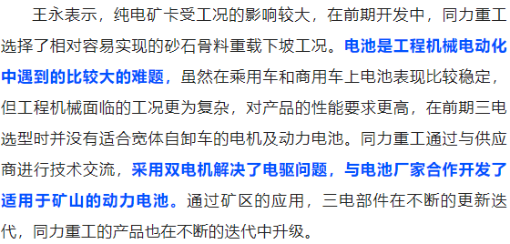 同力重工自2014年起便開始研發(fā)新能源相關(guān)產(chǎn)品,曾經(jīng)在增程技術(shù),混聯(lián)技術(shù),分布式混合驅(qū)動(dòng)技術(shù),純電技術(shù),氫燃料電池技術(shù)等幾乎所有的電動(dòng)化技術(shù)方面進(jìn)行嘗試,并形成了完善、全面的技術(shù)積累。同力重工現(xiàn)已形成全系列純電動(dòng)業(yè)務(wù)礦卡板塊,主要產(chǎn)品包括增程式電動(dòng)礦卡TLH90B、混聯(lián)電動(dòng)礦卡TLH90C,純電動(dòng)礦卡包括60噸級TLE90A/B,70噸級TLE105(充電模式)和TLE105C(換電模式)兩種類型。同力重工在非公路用車領(lǐng)域憑借多年的積累,可靠耐用的產(chǎn)品、優(yōu)質(zhì)高效的服務(wù)引領(lǐng)著非公路用車領(lǐng)域的潮流。
