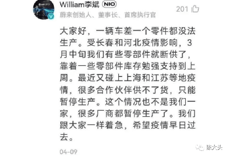4月9日,蔚來(lái)汽車公開(kāi)表示,蔚來(lái)位于吉林,上海,江蘇等地的供應(yīng)鏈伙伴已經(jīng)陸續(xù)停產(chǎn),零部件無(wú)法到位,導(dǎo)致整車停止生產(chǎn)!