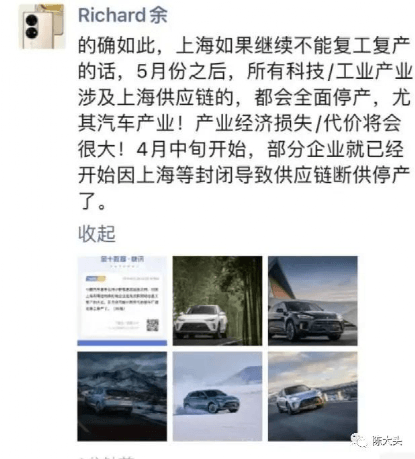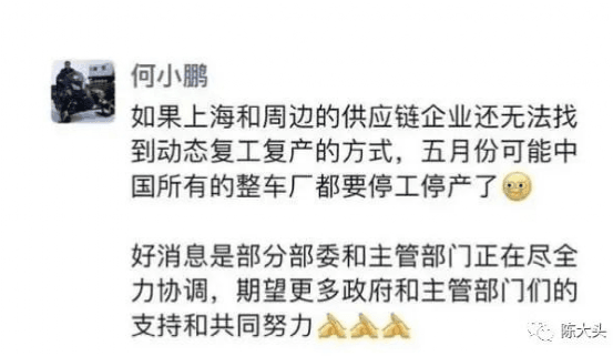 小鵬汽車董事長(zhǎng)何小鵬在朋友圈發(fā)文稱,如果上海和周邊的供應(yīng)鏈企業(yè)還無(wú)法找到動(dòng)態(tài)復(fù)工復(fù)產(chǎn)的方式,五月份可能中國(guó)所有的整車廠都要停工停產(chǎn)了。