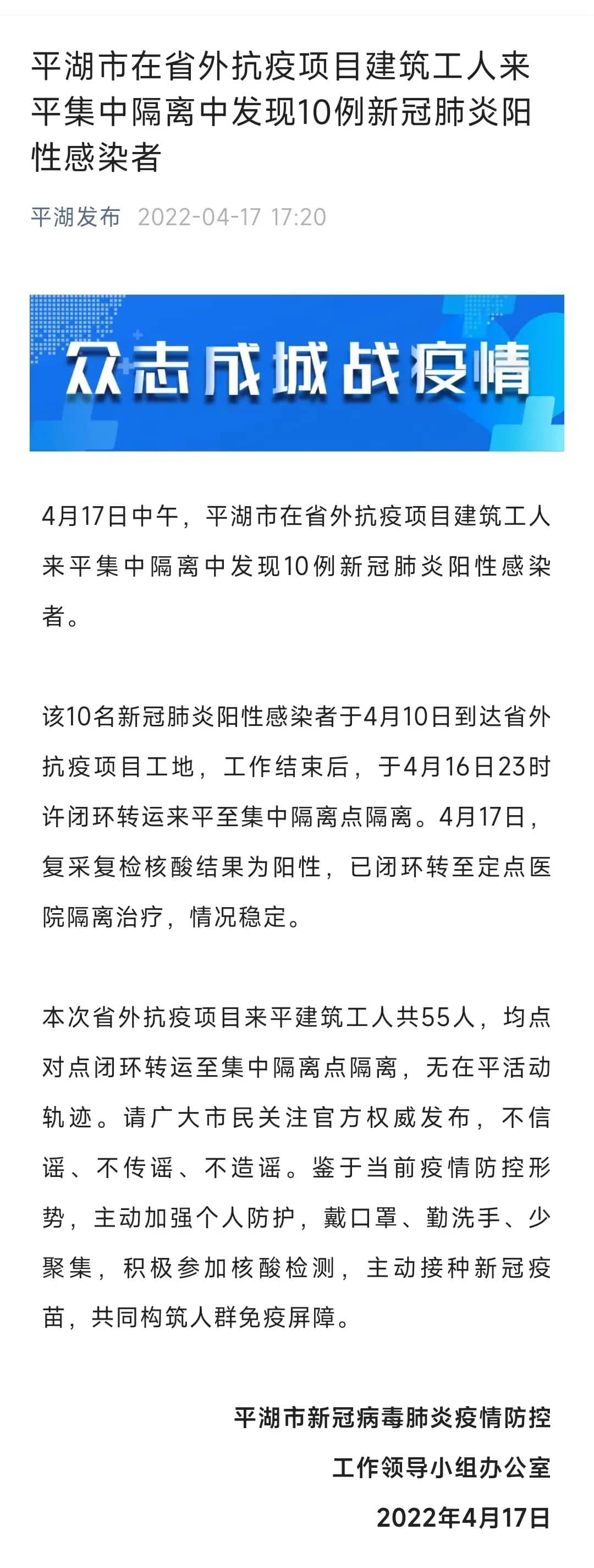 該10名新冠肺炎陽性感染者于4月10日到達(dá)省外抗疫項(xiàng)目工地,工作結(jié)束后,于4月16日23時(shí)許閉環(huán)轉(zhuǎn)運(yùn)來平至集中隔離點(diǎn)隔離。4月17日,復(fù)采復(fù)檢核酸結(jié)果為陽性,已閉環(huán)轉(zhuǎn)至定點(diǎn)醫(yī)院隔離治療,情況穩(wěn)定。