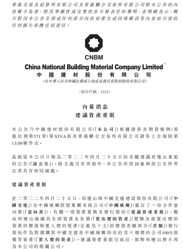 當(dāng)日中國建材發(fā)布公告稱,于2022年4月25日,祁連山與中國交通建設(shè)股份有限公司及中國城鄉(xiāng)控股集團(tuán)有限公司簽訂了一份合作意向書,有關(guān)一項資產(chǎn)置換及發(fā)行股份,擬由祁連山通過其全部資產(chǎn)及負(fù)債置換及就置出標(biāo)的資產(chǎn)的價值與置入標(biāo)的資產(chǎn)的價值差額部分發(fā)行股份作為對價購買中國交建及中國城鄉(xiāng)持有的其六個標(biāo)的公司100%股權(quán)等資產(chǎn)。建議資產(chǎn)重組完成后,預(yù)期祁連山將不再為公司的附屬公司。
