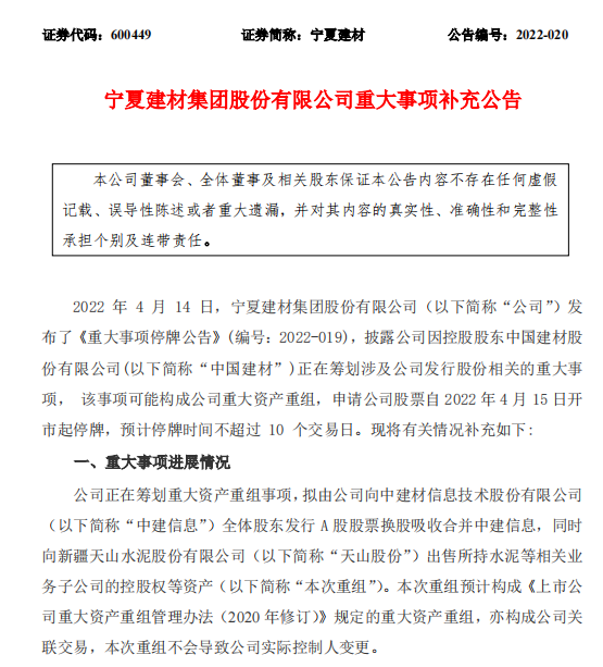 4月15日晚,寧夏建材公告稱,擬由公司向中建材信息技術(shù)股份有限公司全體股東發(fā)行A股股票換股吸收合并中建信息,同時向天山股份出售所持水泥等相關(guān)業(yè)務(wù)子公司的控股權(quán)等資產(chǎn)。天山股份、寧夏建材都由中國建材控股。