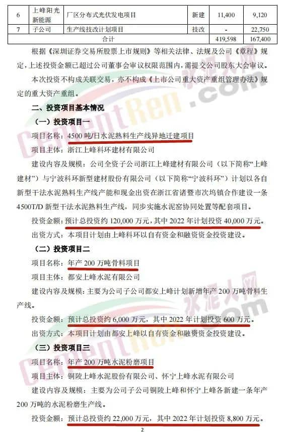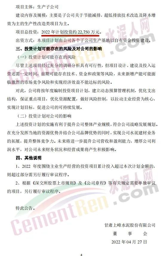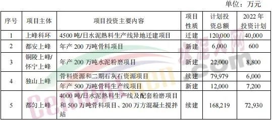 4月27日,甘肅上峰水泥股份有限公司發(fā)布《關(guān)于公司2022年度項(xiàng)目投資計(jì)劃的公告》稱,2022年,其控股子公司浙江上峰科環(huán)建材有限公司、都安上峰水泥有限公司、銅陵上峰水泥股份有限公司、懷寧上峰水泥有限公司、貴州獨(dú)山上峰水泥有限公司、都勻上峰西南水泥有限公司、寧夏上峰萌生建材有限公司和浙江上峰陽(yáng)光新能源有限公司等將通過(guò)一系列的新建、技術(shù)改造、擴(kuò)建等投資方式來(lái)逐步落實(shí)公司主業(yè)規(guī)模的持續(xù)擴(kuò)張。