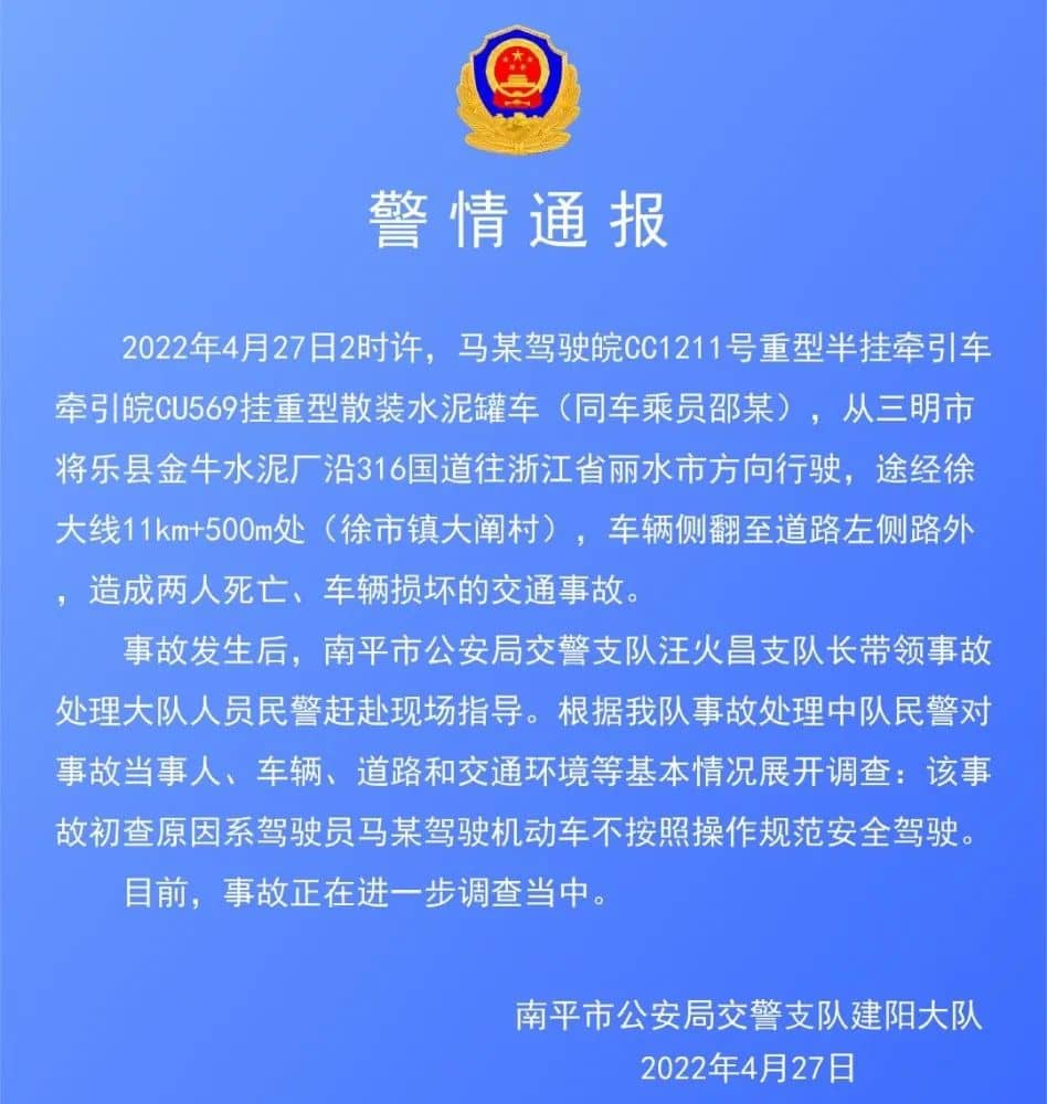 4月27日,福建省南平市公安局交警支隊建陽大隊發(fā)布一則警情通報稱,2022年4月27日2時許,馬某駕駛皖CC1211號重型半掛牽引車牽引皖CU569掛重型散裝水泥罐車(同車乘員邵某),從三明市將樂縣金牛水泥廠沿316國道往浙江省麗水市方向行駛,途經(jīng)徐大線11km+500m處(徐市鎮(zhèn)大闡村), 車輛側(cè)翻至道路左側(cè)路外造成兩人死亡、車輛損壞的交通事故。