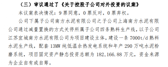 其二為公司下屬子公司南方水泥有限公司之子公司上海南方水泥有限公司通過(guò)減量置換的方式關(guān)停所屬子公司四條熟料生產(chǎn)線,以子公司江蘇宜城南方水泥有限公司為項(xiàng)目建設(shè)主體,建設(shè)一條 7000t/d 熟料水泥生產(chǎn)線,配套 13MW 純低溫余熱發(fā)電系統(tǒng)和年產(chǎn) 290 萬(wàn)噸水泥粉磨系統(tǒng),項(xiàng)目固定資產(chǎn)靜態(tài)投資總額為 18.22億,資金來(lái)源為企業(yè)自有或自籌。