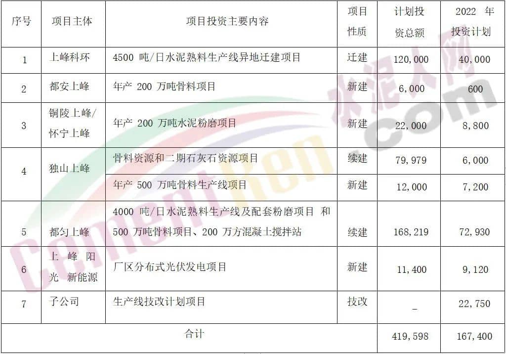 4月26日晚間,甘肅上峰水泥股份有限公司發(fā)布《關(guān)于公司2022年度項(xiàng)目投資計(jì)劃的公告》稱,根據(jù)公司中期戰(zhàn)略發(fā)展規(guī)劃,結(jié)合公司經(jīng)營(yíng)實(shí)際及 2022 年投資重點(diǎn)工作,公司控股子公司浙江上峰科環(huán)建材有限公司、都安上峰水泥有限公司、銅陵上峰水泥股份有限公司、懷寧上峰水泥有限公司、貴州獨(dú)山上峰水泥有限公司、都勻上峰西南水泥有限公司、寧夏上峰萌生建材有限公司和浙江上峰陽(yáng)光新能源有限公司等將通過(guò)一系列的新建、技術(shù)改造、 擴(kuò)建等投資方式來(lái)逐步落實(shí)公司主業(yè)規(guī)模的持續(xù)擴(kuò)張,上述投資項(xiàng)目計(jì)劃將主要圍繞公司主業(yè)經(jīng)營(yíng)發(fā)展,以此進(jìn)一步增加公司盈利能力,提升公司綜合實(shí)力。經(jīng)預(yù)測(cè),上述項(xiàng)目總投資額為人民幣419,598萬(wàn)元,其中2022年度計(jì)劃投資金額為167,400 萬(wàn)元。
