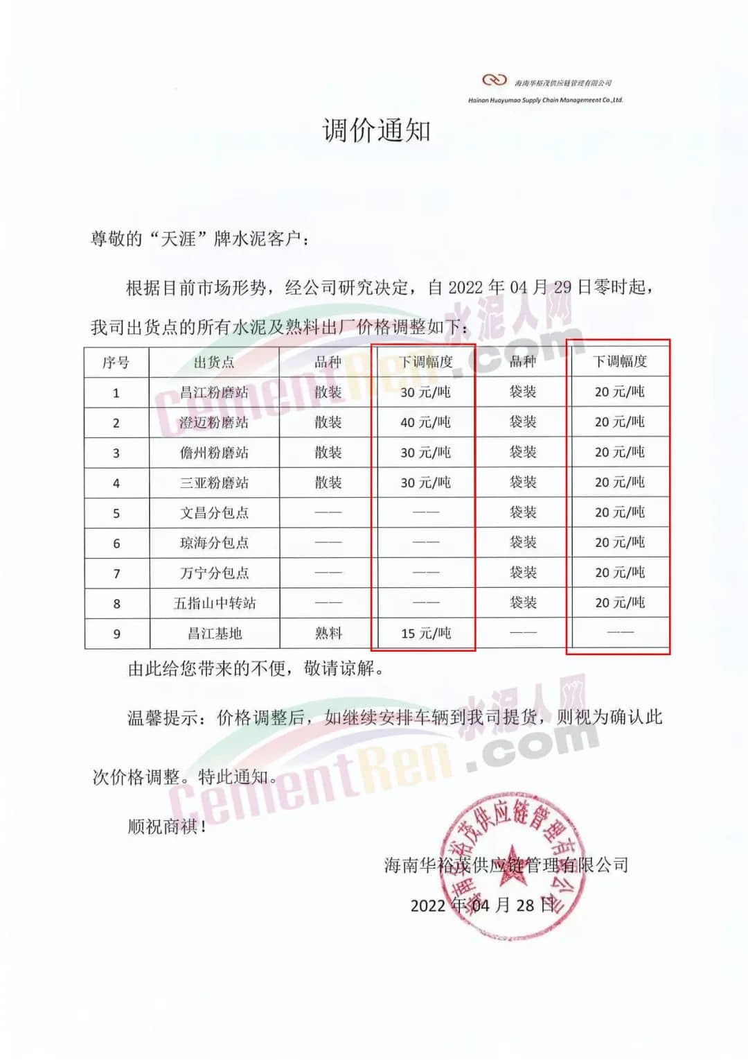海南華裕茂供應(yīng)鏈管理有限公司發(fā)函通知“天涯”牌水泥客戶稱,根據(jù)目前市場形勢,經(jīng)公司研究決定,自 2022年4月29日零時(shí)起,公司出貨點(diǎn)的所有水泥及熟料出廠價(jià)格下調(diào)20-40元/噸。