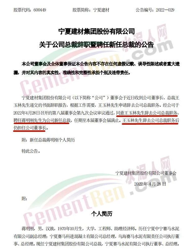 4月28日,寧夏建材集團(tuán)股份有限公司發(fā)布《關(guān)于公司總裁辭職暨聘任新任總裁的公告》稱,同意王玉林先生辭去公司總裁職務(wù),聘任蔣明剛先生為公司新任總裁,任期至本屆董事會屆滿止。王玉林先生辭去公司總裁職務(wù)后仍擔(dān)任公司董事長。