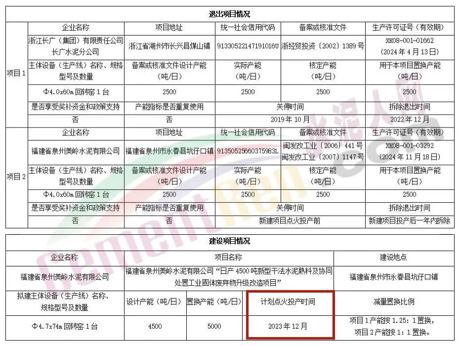 據(jù)水泥人網(wǎng)了解,此前,福建省工信廳曾發(fā)布《關(guān)于福建省泉州美嶺水泥有限公司日產(chǎn)4500噸新型干法水泥熟料生產(chǎn)線建設(shè)項目產(chǎn)能置換方案的公告》,公告顯示,福建省泉州美嶺水泥有限公司“日產(chǎn)4500噸新型干法水泥熟料及協(xié)同處置工業(yè)固體廢棄物升級改造項目”由浙江長廣(集團)有限責(zé)任公司長廣水泥分公司2500t/d和福建省泉州美嶺水泥有限公司2500t/d分別按照1.25:1和1:1的置換比例置換而來。計劃點火投產(chǎn)時間為2023年12月。