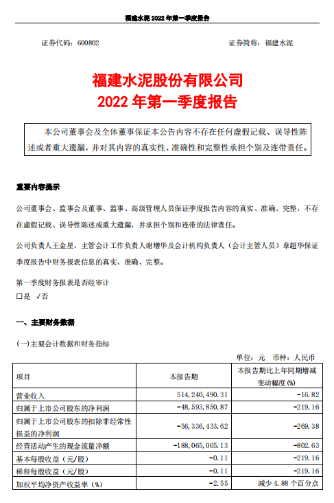 福建水泥4月29日晚間發(fā)布一季度業(yè)績(jī)公告稱,2022年第一季度營(yíng)收約5.14億元;歸屬于上市公司股東的凈利潤(rùn)虧損約4859萬(wàn)元;基本每股收益虧損0.11元。