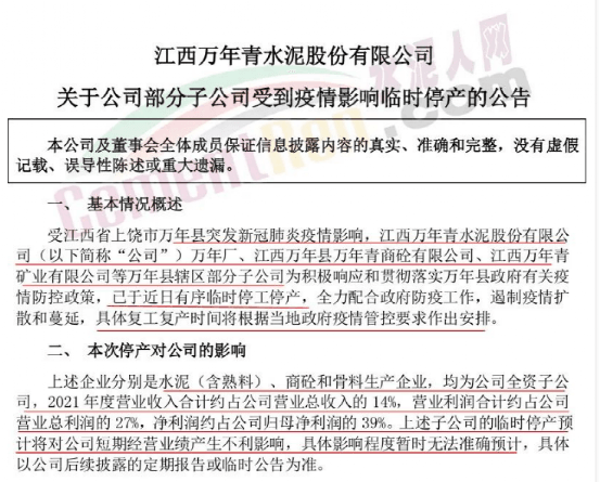 同期,上市公司萬年青發(fā)公告稱,受疫情影響,旗下多家子公司停工停產(chǎn)。停產(chǎn)所涉及的子公司占企業(yè)2021年度營業(yè)總收入的14%,營業(yè)利潤約占總營業(yè)潤的27%,凈利潤約占公司歸母凈利潤的39%。臨時(shí)停產(chǎn)將對公司短期經(jīng)營業(yè)績產(chǎn)生不利影響,具體影響程度暫時(shí)無法準(zhǔn)確預(yù)計(jì)。