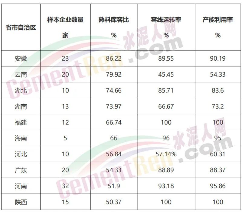 據(jù)水泥人網(wǎng)五月初調(diào)研數(shù)據(jù)顯示,安徽、云南、湖北、湖南、福建、海南、河北、廣東、河南、陜西等十余個(gè)省份,熟料庫容比均在50%以上,其中安徽、云南等省份達(dá)到了80%左右。產(chǎn)能利用率方面僅福建和陜西達(dá)到了100%。