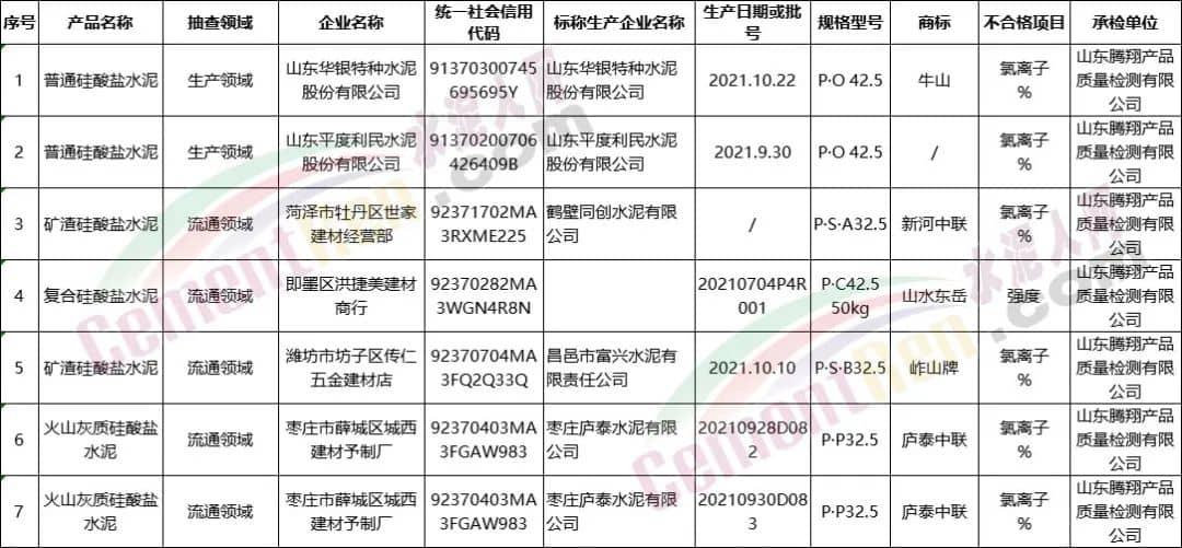 抽查發(fā)現(xiàn)山東華銀特種水泥股份有限公司、山東平度利民水泥股份有限公司2家生產(chǎn)者的2批次產(chǎn)品和菏澤市牡丹區(qū)世家建材經(jīng)營部、即墨區(qū)洪捷美建材商行、濰坊市坊子區(qū)傳仁五金建材店、棗莊市薛城區(qū)城西建材予制廠4家銷售者的5批次產(chǎn)品不符合相關(guān)標(biāo)準(zhǔn)的要求,不合格項(xiàng)目為氯離子、強(qiáng)度項(xiàng)目。