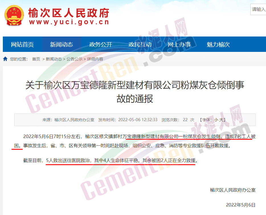 山西晉中榆次區(qū)人民政府消息:2022年5月6日7時(shí)15分左右,榆次區(qū)修文鎮(zhèn)郭村萬寶德隆新型建材有限公司一粉煤灰倉發(fā)生傾倒,造成7名工人被困。