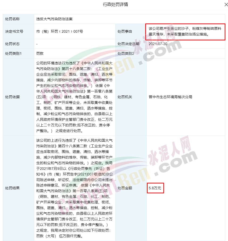 天眼查行政處罰信息顯示,2021年7月30日,因易產(chǎn)生揚(yáng)塵的沙子、粉煤灰等制磚原料露天堆存,未采取覆蓋防治揚(yáng)塵措施該馬來被晉中市生態(tài)環(huán)境局榆次分局處以罰款5.8萬元。