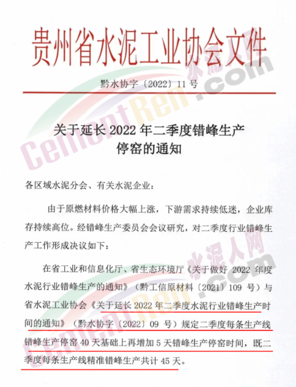在貴州省工業(yè)和信息化廳、省生態(tài)環(huán)境廳《關(guān)于做好2022年度水泥行業(yè)錯(cuò)峰生產(chǎn)的通知》與省水泥工業(yè)協(xié)會(huì)《關(guān)于延長(zhǎng)2022年二季度水泥行業(yè)錯(cuò)峰生產(chǎn)時(shí)間的通知》規(guī)定二季度每條生產(chǎn)線(xiàn)錯(cuò)峰生產(chǎn)停窯40天基礎(chǔ)上再增加5天錯(cuò)峰生產(chǎn)停窯時(shí)間,既二季度每條生產(chǎn)線(xiàn)精準(zhǔn)錯(cuò)峰生產(chǎn)共計(jì)45天。有關(guān)要求如下∶