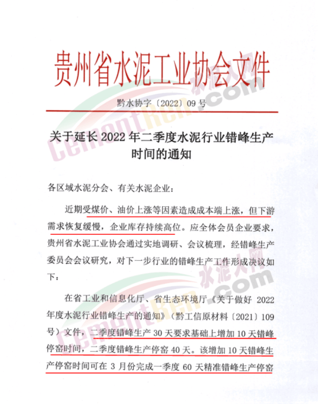 據(jù)水泥人網(wǎng)此前消息,3月16日,貴州省水泥工業(yè)協(xié)會(huì)發(fā)布了《關(guān)于延長(zhǎng)2022年二季度水泥行業(yè)錯(cuò)峰生產(chǎn)時(shí)間的通知》稱(chēng),受煤價(jià)、油價(jià)上漲等因素造成成本端上漲,但下游需求恢復(fù)緩慢,企業(yè)庫(kù)存持續(xù)高位。應(yīng)企業(yè)要求延長(zhǎng)2022年錯(cuò)峰生產(chǎn)時(shí)間,其中二季度錯(cuò)峰生產(chǎn)30天要求基礎(chǔ)上增加10天錯(cuò)峰停窯時(shí)間,二季度錯(cuò)峰生產(chǎn)停窯40天。
