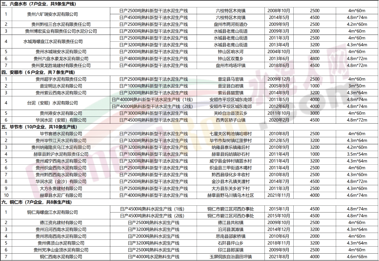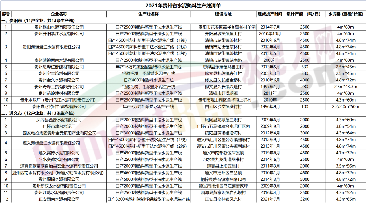 從貴州省工信廳發(fā)布的《2021年度水泥熟料生產(chǎn)線(xiàn)清單》可見(jiàn)貴州省內(nèi)共有水泥熟料生產(chǎn)線(xiàn)94條,合計(jì)產(chǎn)能8449.2萬(wàn)噸。