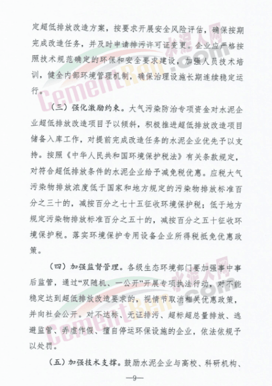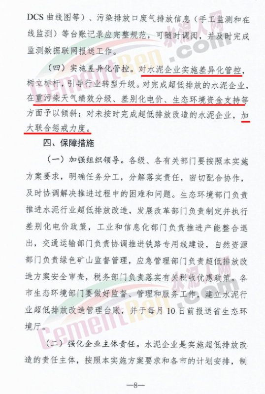 對(duì)完成超低排放的水泥企業(yè),在重污染天氣績(jī)效分級(jí)、差別化電價(jià)、生態(tài)環(huán)境資金支持等方面予以傾斜;對(duì)未按時(shí)完成超低排放改造的水泥企業(yè),加大聯(lián)合懲戒力度。