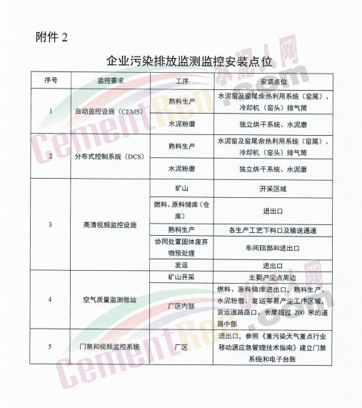 實(shí)施超低排放改造的水泥企業(yè),應(yīng)按要求全面加強(qiáng)自動(dòng)監(jiān)控、過程監(jiān)控和視頻監(jiān)控設(shè)施建設(shè)。在水泥窯及窯尾余熱利用系統(tǒng)、冷卻機(jī)(窯頭)、獨(dú)立烘干系統(tǒng)、水泥磨等均安裝自動(dòng)監(jiān)控設(shè)施(CEMS)和分布式控制系統(tǒng)(DCS),采用氨法脫硝、脫硫的企業(yè)在線監(jiān)測(cè)設(shè)施應(yīng)增加氨逃逸監(jiān)測(cè)。