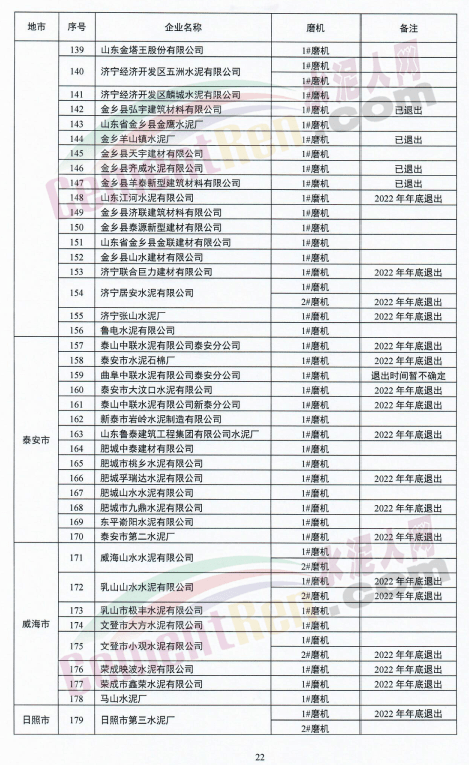 單體粉磨站標(biāo)注為“退出”或“拆除”的共164臺(tái)磨機(jī),其中今年底前退出的共156臺(tái),5月份退出的2臺(tái)。已退出的4臺(tái)磨機(jī)。山東臨朐振龍水泥有限公司1#磨機(jī)標(biāo)注為“已拆除”。曲阜中聯(lián)水泥有限公司泰安分公司l#磨機(jī)標(biāo)注為“退出時(shí)間暫不確定”。