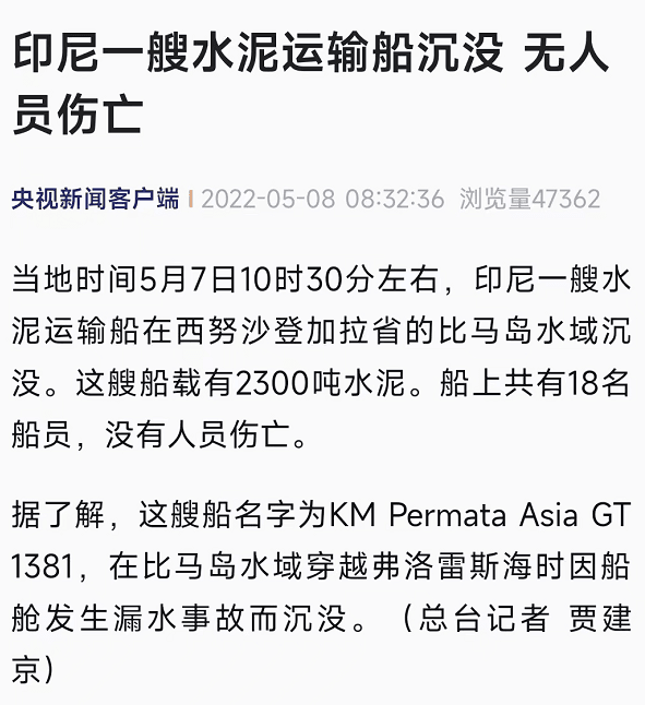 央視新聞客戶端消息:當(dāng)?shù)貢r(shí)間5月7日10時(shí)30分左右,印尼一艘水泥運(yùn)輸船在西努沙登加拉省的比馬島水域沉沒(méi)。這艘船載有2300噸水泥。船上共有18名船員,沒(méi)有人員傷亡。