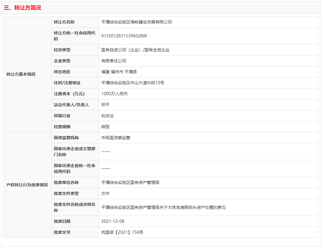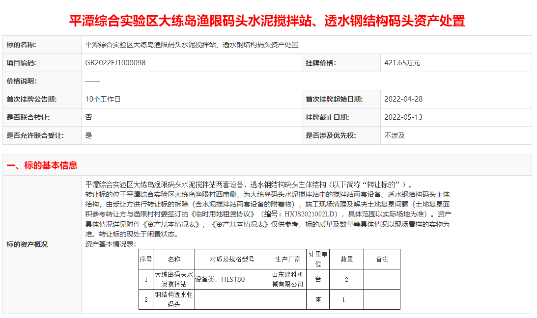 日前,福建省產(chǎn)權(quán)交易中心發(fā)布《平潭綜合實驗區(qū)大練島漁限碼頭水泥攪拌站、透水鋼結(jié)構(gòu)碼頭資產(chǎn)處置》項目,掛牌價格為421.65萬元。