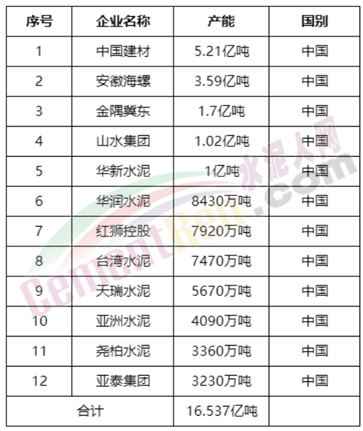 據(jù)不完全統(tǒng)計,截止全球水泥產(chǎn)能前三十強企業(yè)合計產(chǎn)能達到29.078億噸。其中中國水泥企業(yè)占據(jù)12個席位,產(chǎn)能合計16.537億噸,占比近56.9%。 中國建材、安徽海螺、金隅冀東、山水集團、華新水泥、華潤水泥均進入前十。