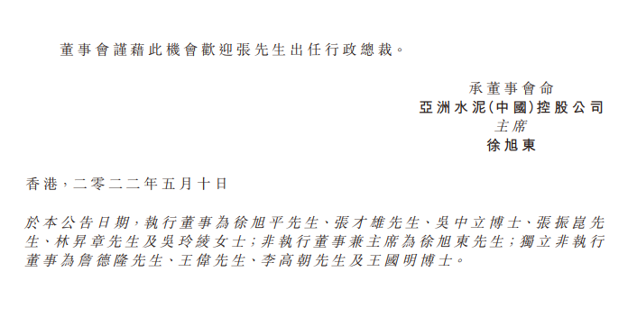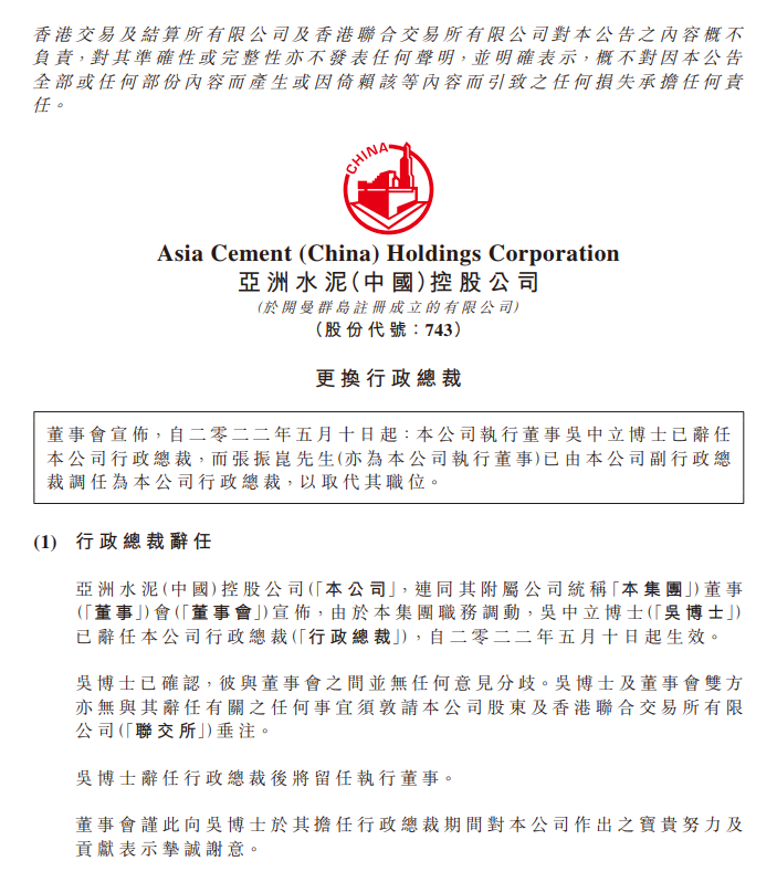 亞洲水泥(中國(guó))發(fā)布公告,自2022年5月10日起:公司執(zhí)行董事吳中立博士已辭任公司行政總裁,而張振昆先生(亦為公司執(zhí)行董事)已由公司副行政總裁調(diào)任為公司行政總裁,以取代其職位。