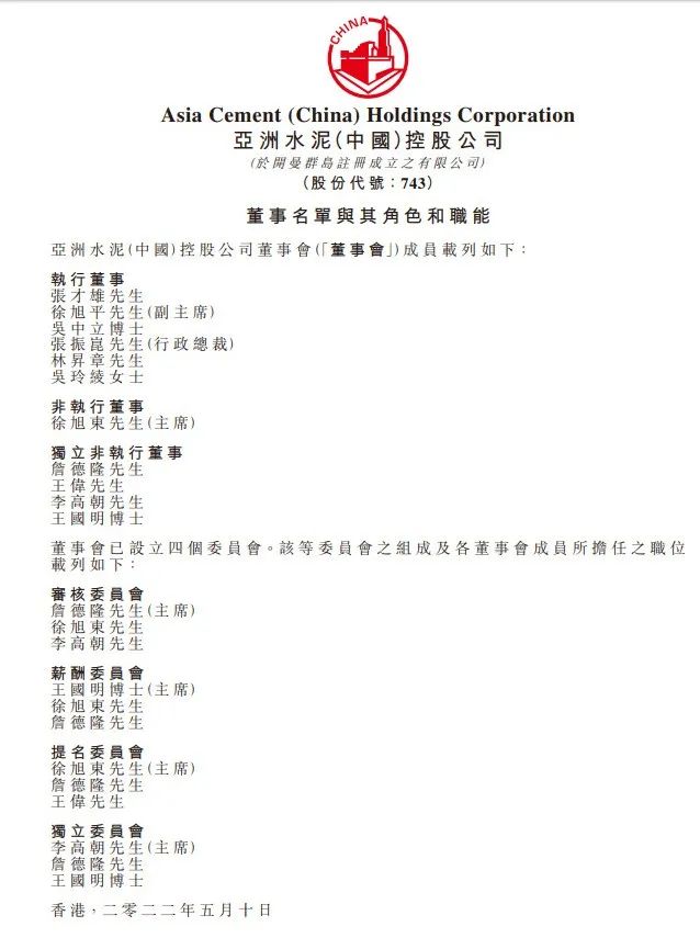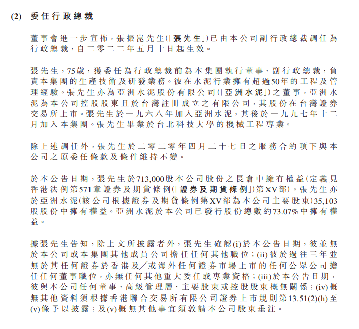 張先生亦為臺(tái)灣上市公司亞洲水泥集團(tuán)之董事。