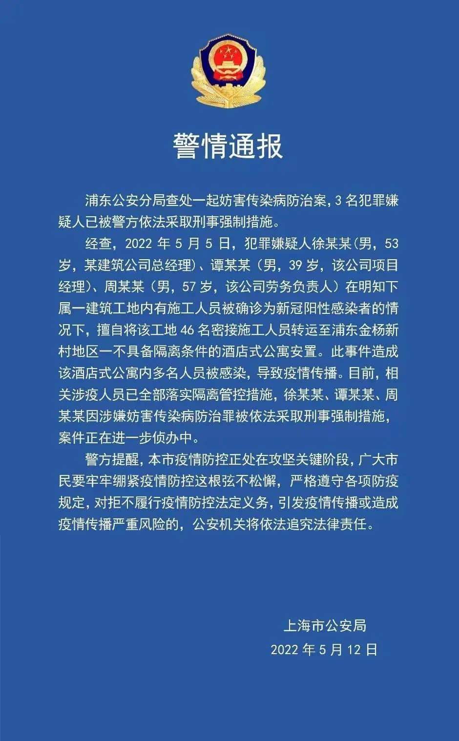 經(jīng)查,2022年5月5日,犯罪嫌疑人徐某某(男,53歲,某建筑公司總經(jīng)理)、譚某某(男,39歲,該公司項(xiàng)目經(jīng)理)、周某某(男,57歲,該公司勞務(wù)負(fù)責(zé)人)在明知下屬一建筑工地內(nèi)有施工人員被確診為新冠陽性感染者的情況下,擅自將該工地46名密接施工人員轉(zhuǎn)運(yùn)至浦東金楊新村地區(qū)一不具備隔離條件的酒店式公寓安置。