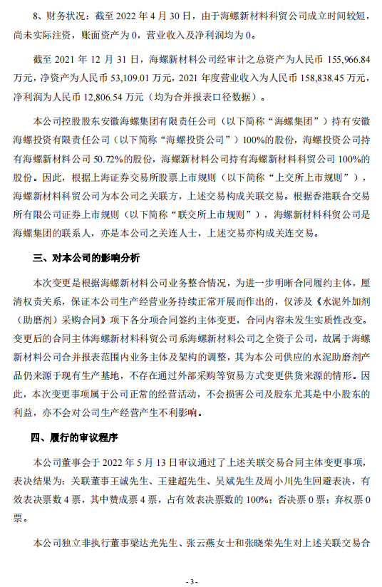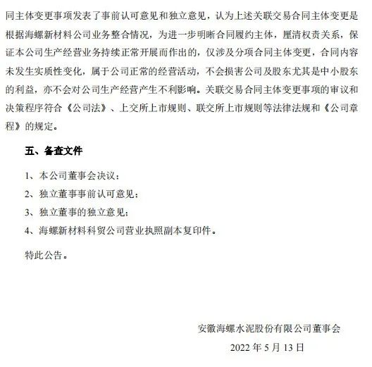 日前,海螺水泥發(fā)布《關(guān)于關(guān)聯(lián)交易合同主體變更的公告》稱,2022年5月13日,安徽海螺水泥股份有限公司與安徽海螺新材料科技有限公司簽訂《關(guān)于<水泥外加劑(助磨劑)采購(gòu)合同>的補(bǔ)充協(xié)議》,約定自《補(bǔ)充協(xié)議》簽訂之日起,將《水泥外加劑(助磨劑)采購(gòu)合同》項(xiàng)下各分項(xiàng)合同簽約主體由海螺新材料公司變更為其全資子公司安徽海螺新材料科技貿(mào)易有限公司,除此之外,原合同中其它條款和條件保持不變并具有完全效力。