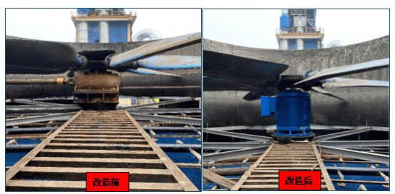 冷卻塔驅(qū)動改造前后對比數(shù)據(jù)可見,設(shè)備改前電機功率為55KW,運行功率為52KW。應(yīng)客戶要求改造后需提升冷卻風(fēng)量,電機需從原136轉(zhuǎn)/分鐘提升轉(zhuǎn)速至150轉(zhuǎn)/分鐘。