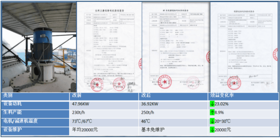 該風(fēng)掃煤球磨機設(shè)備改前電機功率為900KW,運行功率均值為660KW,轉(zhuǎn)速為118轉(zhuǎn)/分,改后直驅(qū)電機額定功率不變,轉(zhuǎn)速為120轉(zhuǎn)/分,運行功率均值為560KW,每小時節(jié)電100KWh,有功節(jié)電率為15.15%。